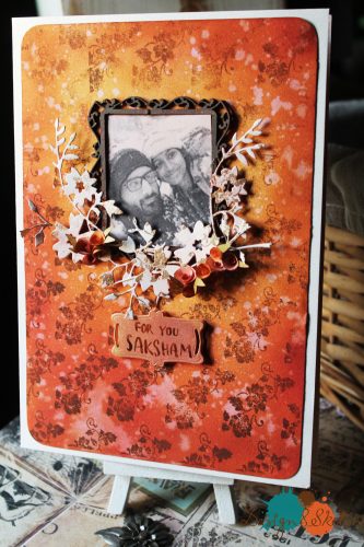 So I asked her for a lovely pic of her and her boyfriend, which I then photoshopped and printed in a monochrome so that it matched the overall tone of the card. I used a strong, 250 gsm card for the base, and framed the picture with a cardboard cutout on top. I painted the top with red and orange inks and acrylics, while adding hand cut and handmade flowers and leaves as flourishes to make the card look more unique. I also added the letters, “For you, Saksham” on Pamela’s request.